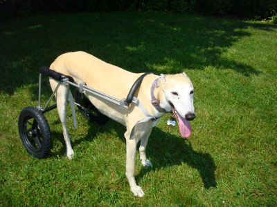 Tully, le Greyhound distingué de la S.P.A. remercie pour le don de son appareillage orthopédique.