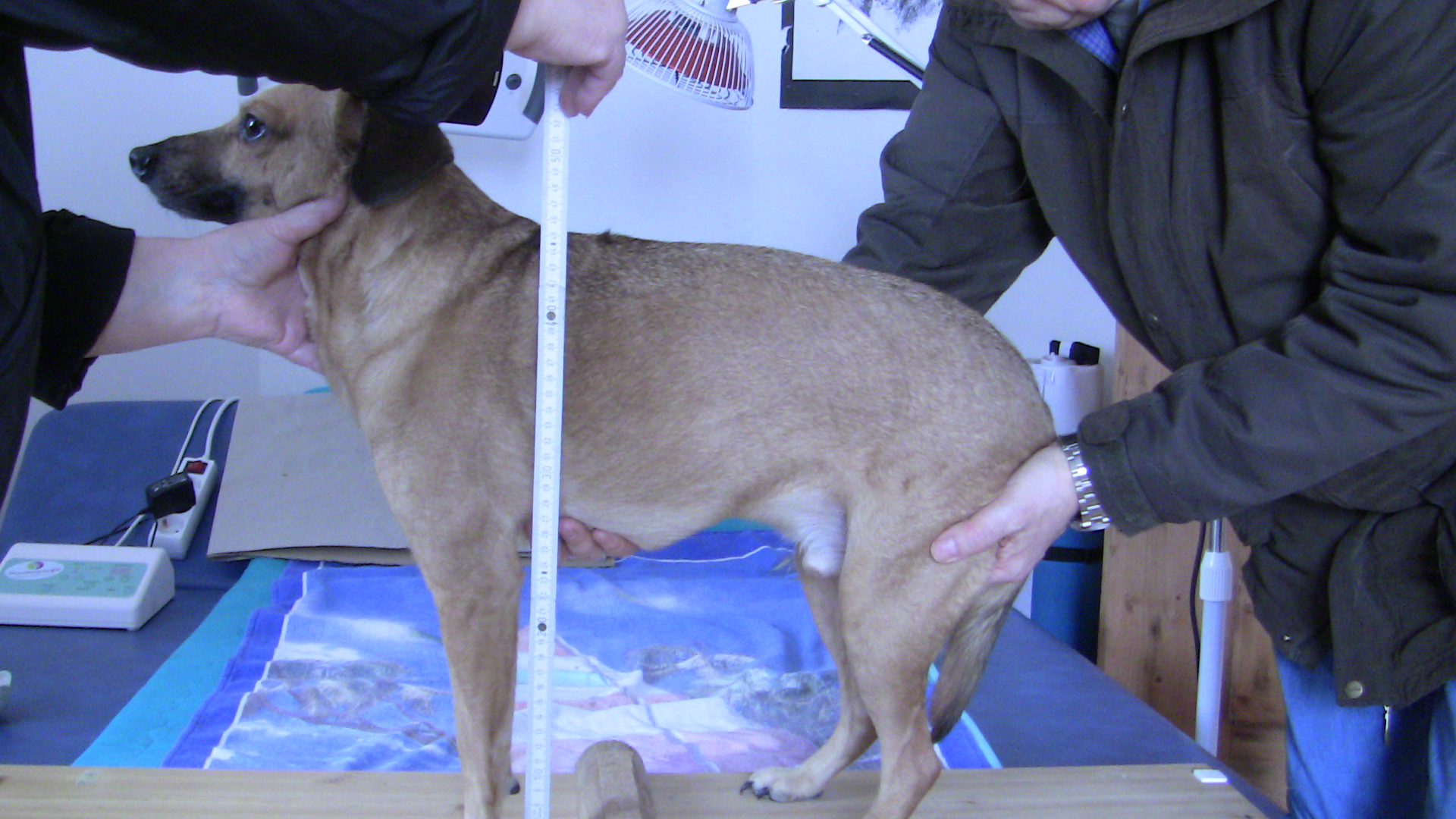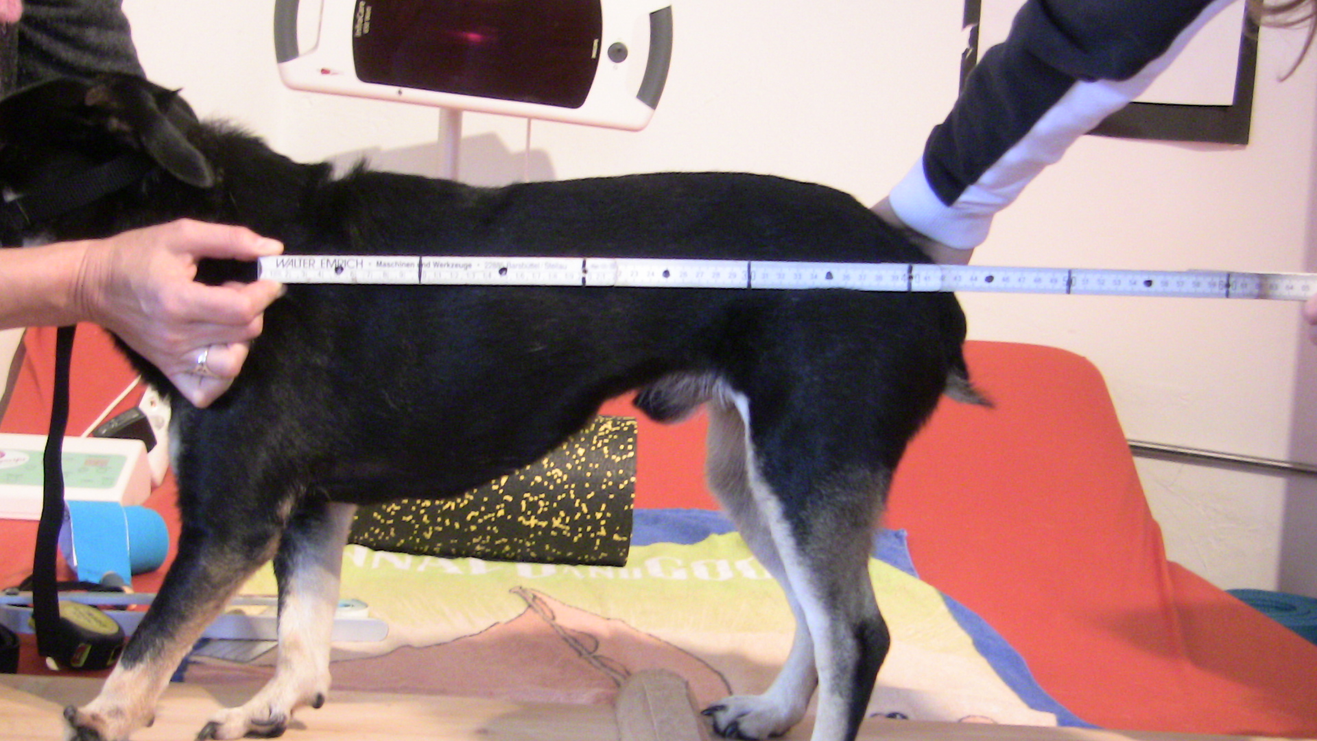 Tenez compte en mesurant, si vous soutenez le chien, d'une ligne de dos aussi droite que possible et d'une position et d'un pliage physiologiques des pattes de derrière comment vous le voyez sur la photo d'exemple d'un "kangourou". Comparez H directement à D. Parce-que toujours, pour chaque chien, le H est plus petit que le D!