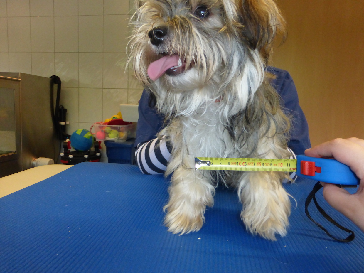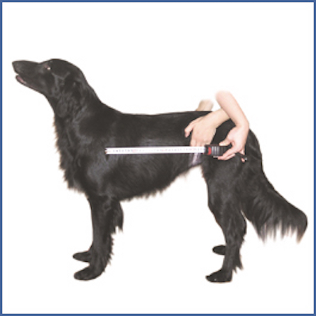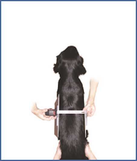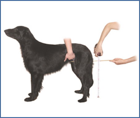 Tenez votre chien débout dans une position physiologique en le maintenant par un harnais ou une serviette. Toutes les pattes devraient rester au sol et la ligne de dos doit être droite. Laissez vous aider d'une deuxième personne qui tire l'attention du chien, de sorte qu'il regarde en avant. Toutes les mesures doivent être faits avec l'animal dans une position debout et physiologique. Utilisez un mètre où une réglette rigide pour obtenir des mesures précises, s.v.p. Laissez vous aider par une autre personne.
