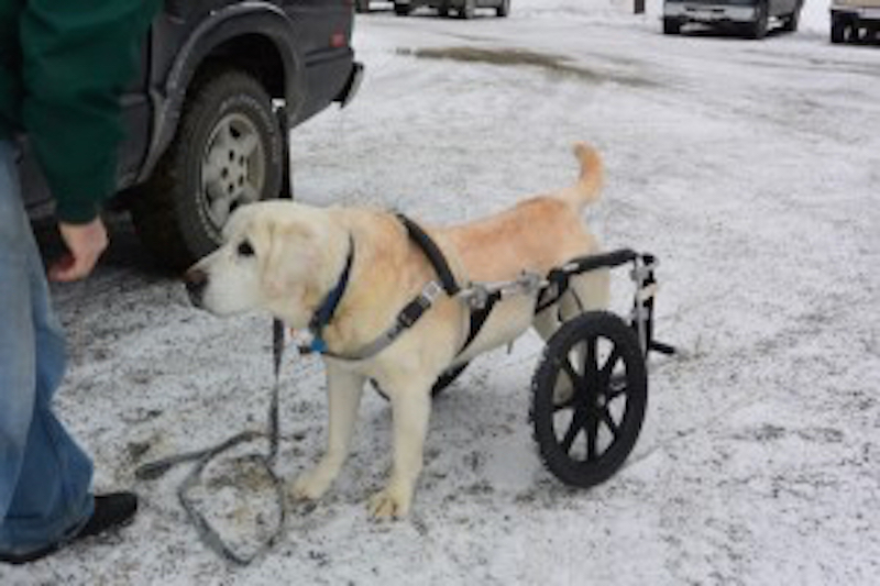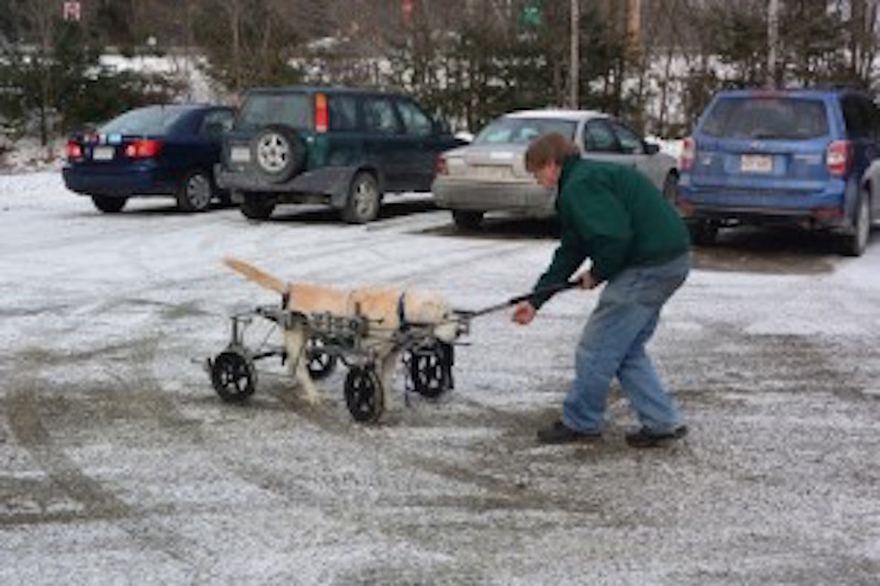 Un matin le propriétaire de Crockett en provenance de New Hampshire m'a donné un coup de fil et a demandé rendez-vous pour son chien. Crockett, un vieux labrador jaune de 14 ans et bien 40kg restait étendu - incapable de peser sur un seul de ses quatre jambes. Le vétérinaire a conseillé de lui faire piquer. ... Il serait trop gros pour rester par terre, et en plus il n'avait pas uriné depuis 24 heures.